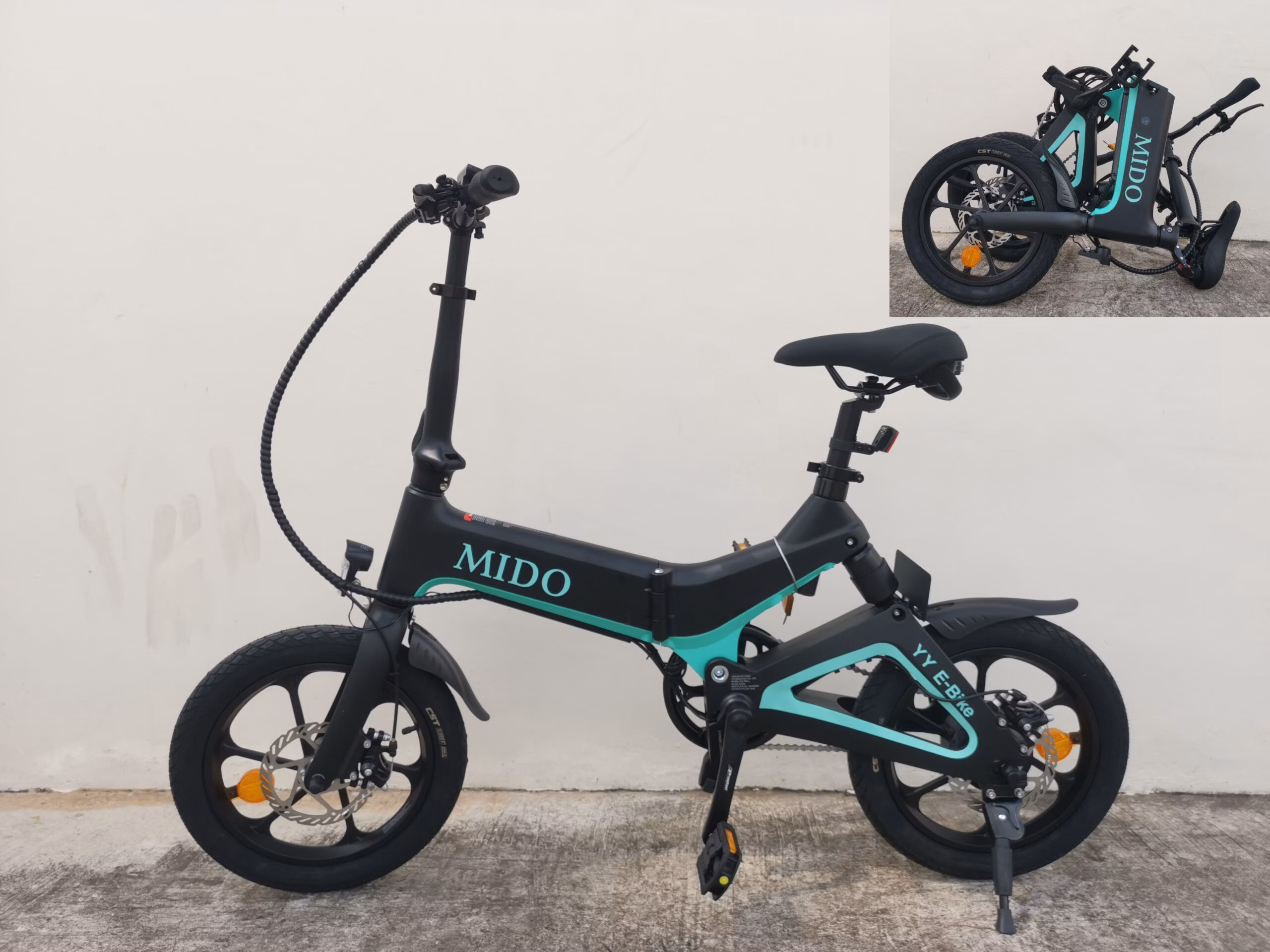 The Mido E-Bike is a 19.3kg, 142 x 22 x 71 cm Electric Bicycle. It can travel about 50km with a maximum load of 60kg at a maximum speed of 25km/h. Similar to other E-Bikes on the market, it is equipped with a 16 Inch Pneumatic CST pair of tyres.